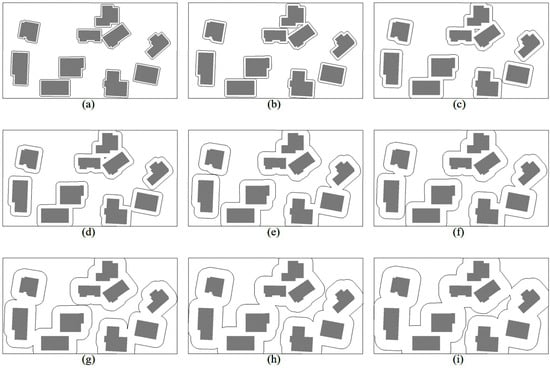 Until now, we have considered the open-space ratio function of a single building. In this section, we show a method for obtaining the open-space ratio function of a clump of buildings, such as a housing complex represented by the gray polygons in Figure 1. The first step is to obtain the clumps of buildings. The exact method is as follows: first, to construct the area Voronoi diagram (Section 3.6 in []); second, to construct the area Delaunay diagram; third, to construct the MPT for polygons. Currently, the first computation cannot be carried out by the operators of standard GIS, although it can be performed by an open-source program []; however, there are very few easy-to-access software that are able to perform the second and third computations. Alternatively, we propose a simple method using a function of the open-space ratio function. We generate the buffer zone with -width for with equal intervals. The choice of the interval depends on the precision level. An example is illustrated in Figure 8. As the width increases (Figure 8a–h), the number of clumps decreases. In the end, all buildings form one clump (Figure 8f). This procedure results in hierarchical clumps. It is time-consuming work to generate by hand but can be easily performed by a processing modeler provided by standard GIS. The outline of this procedure is shown in Appendix A. Using this method, we obtained the clumps of buildings in the case of 6 m wide buffer zones in Figure 9. The incremental open-space function can be obtained from Equation (2) by just replacing with the union of the buildings forming a clump. The result is illustrated in Figure 10. As expected, the open-space ratio is high (1.0) within 10 m around the clump.