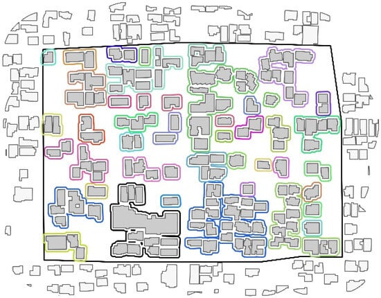 The clumps of buildings in the case of 6 m wide buffer zones. Buildings belonging to the same clump are surrounded by the same color.