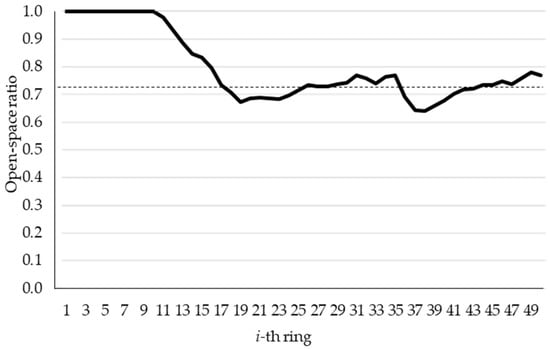 The incremental local open-space function of the clump of buildings indicated by the black curve in Figure 9. The width of a ring is 1 m. The dotted horizontal line indicates the average open-space ratio in the whole study area.