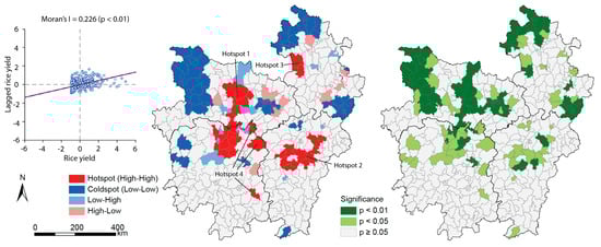 Figure 3 comprehensively depicts the spatial patterns and characteristics of rice yield within the principal rice-producing regions in our study area. Analyzing the spatial distribution of rice yield reveals valuable insights into the regional variations in production outcomes. The overall spatial global Moran’s I, a measure of spatial autocorrelation, is calculated at 0.226 (p < 0.01), indicating a statistically significant level of spatial clustering in rice yield. This highlights that rice production is not uniform across the study area but exhibits distinct spatial dependence patterns.