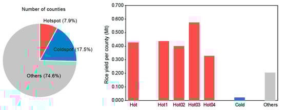 In the hotspot regions, counties exhibit a notably higher average rice yield per county, with an average of 0.428 million tons. This region, characterized by its elevated rice production, is further subdivided into four subclusters denoted as “hotspot region 1”, “hotspot region 2”, “hotspot region 3”, and “hotspot region 4.” These subclusters showcase varying levels of rice yield within the broader hotspot region. For instance, “hotspot region 3” stands out with the highest average rice yield at 0.575 million tons per county, indicating areas of exceptional rice production within the hotspot cluster.
