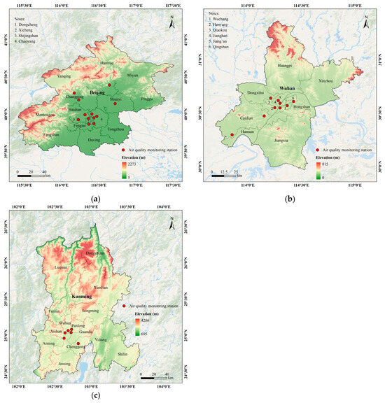 The distribution of air quality monitoring stations: (a) The distribution of air quality monitoring stations in Beijing; (b) The distribution of air quality monitoring stations in Wuhan; (c) The distribution of air quality monitoring stations in Kunming.