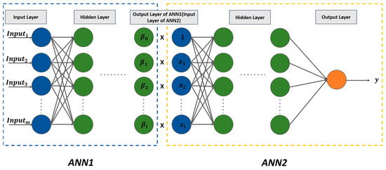 GWNN consisted of two ANNs with different roles. The ANN1 is a coefficient estimation neural network used to learn the coefficients β in GWR. Any reasonably defined distance metric can be used for GWR model solving [43]. Simple spatial distances could not express the complex spatial relationships between stations. Consequently, we designated the PM2.5 concentration data from neighboring stations surrounding the target station within the previous 24 h of the prediction time as the ANN1 input. This was used to capture the spatial relationship of PM2.5 concentration among different stations. The ANN1 output was the regression coefficient β. The product of the regression coefficient β (learned by ANN1) and the dependent variable x was employed as input to the second neural network, ANN2. The independent variable x contained the constant 1 and the features selected by the mRMR. Through the nonlinear transformation, ANN2 provided the predicted output value, y. Both ANN1 and ANN2 consisted of an input layer, multiple hidden layers, and an output layer.