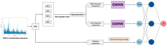 Based on data decomposition, mRMR, and GWNN, this study proposed a hybrid model EMD-mRMR-GWNN for PM2.5 concentration prediction, as shown in Figure 3. The EMD reduced the non-stationarity of the original PM2.5 sequence by decomposing it into a set of subsequences. Additionally, the one-sample t-test was introduced to classify and reconstruct the subsequences into high-frequency component and low-frequency components. The mRMR was used to select features that were highly correlated with the target variable and had less redundancy. This approach aimed to reduce model complexity while improving prediction accuracy. GWNN was used for predicting high-frequency and low-frequency components. GWNN integrated the geographically weighted idea into ANN, leveraging the nonlinear modeling capabilities of ANN and the spatial correlation capturing ability of GWR to improve prediction accuracy. The model was implemented as follows: