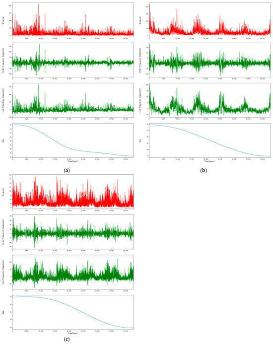 Reconstruction result of PM2.5 IMFs: (a) Reconstruction result of PM2.5 IMFs of Beijing 1005A Station; (b) Reconstruction result of PM2.5 IMFs of Wuhan 1328A Station; (c) Reconstruction result of PM2.5 IMFs of Kunming 1454A Station.