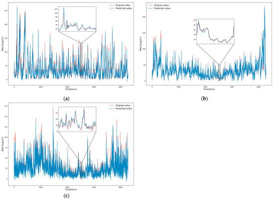 Prediction results of EMD-mRMR-GWNN in forecasting PM2.5 concentration for the next 1 h: (a) Prediction results of EMD-mRMR-GWNN at Beijing 1005A Station; (b) Prediction results of EMD-mRMR-GWNN at Wuhan 1328A Station; (c) Prediction results of EMD-mRMR-GWNN at Kunming 1454A Station.