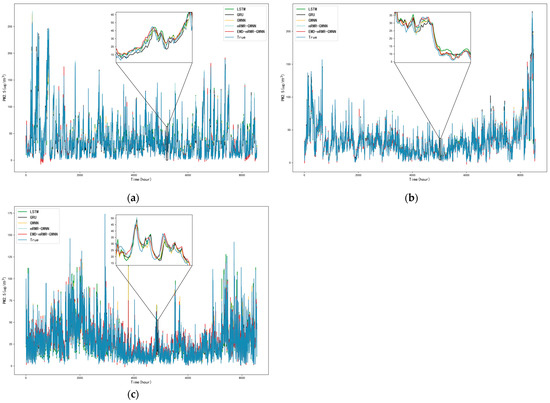 Prediction results of comparative models in forecasting PM2.5 concentration for the next 1 h: (a) Prediction results of comparative models at Beijing 1005A Station; (b) Prediction results of comparative models at Wuhan 1328A Station; (c) Prediction results of comparative models at Kunming 1454A Station.