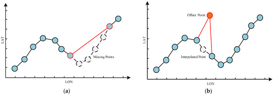 For significantly deviated trajectory points, they are considered as missing values, and methods for missing value imputation are employed to address these anomalies. By comparing a ship’s trajectory point with its adjacent points, the deviated trajectory points are identified. If the distance between the current trajectory point and its neighboring points and is substantially different, exceeding a predefined threshold, then point is deemed a trajectory deviation point.
