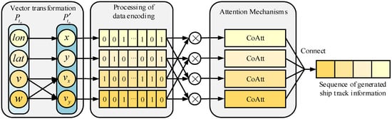 In practical applications, the ACoAtt module initially calculates the self-attention weights for each attribute embedding, subsequently leveraging these weights to augment the embeddings, thereby accentuating the attributes most pertinent to the current moment. Notably, distinct CoAtt modules are designed to recalibrate the embeddings of each ship trajectory attribute independently. The interplay between and , as well as and , is orchestrated in a manner that fosters mutual influence, with each module addressing different dimensions of attribute relationships and data characteristics.
