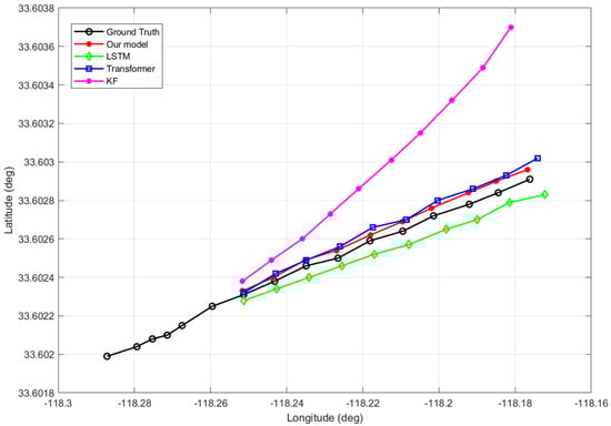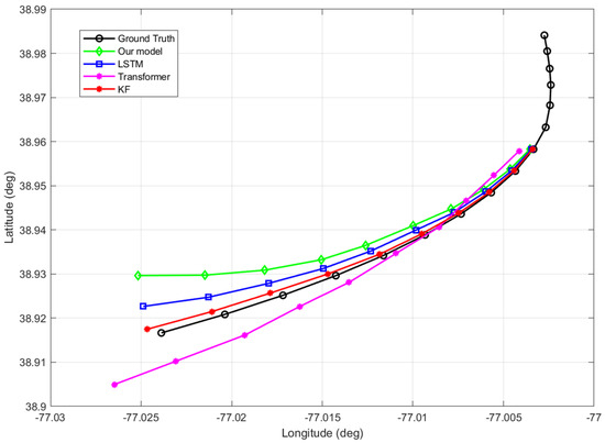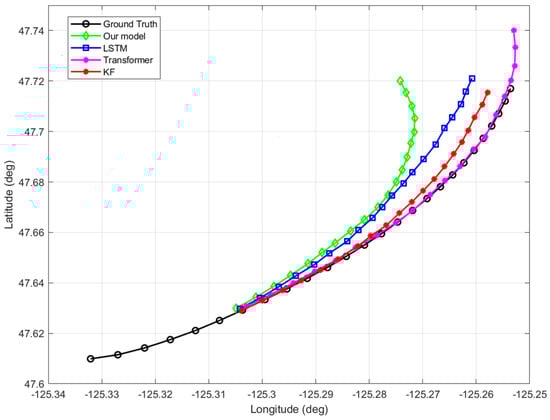 Subsequently, an analysis focused on the trend-following aspect of predictions was conducted. The method proposed in this manuscript, in comparison to other models, can swiftly forecast future motion trends within several prediction steps, as depicted in Figure 10. The model presented here is capable of stably and accurately predicting ships’ curvilinear maneuvering navigation. In contrast, the Transformer model, due to its attention mechanism, can correctly predict trajectory change trends, yet its predictive accuracy falls short. The LSTM-based prediction model, on the other hand, erroneously estimates the ships’ maneuvering intent, gradually diverging from the true course in subsequent prediction steps. Kalman Filter predictions made more accurate forecasts regarding future trajectory trends in this round of testing, but the deviation between predicted points and actual trajectory points was too significant, resulting in subpar overall predictive performance.