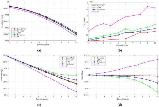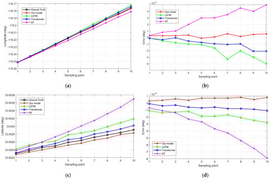 Comparison of prediction results and errors for curved maneuver routes. (a) Comparison of predictive outcomes in longitude. (b) Contrast of predictive errors in longitude. (c) Comparison of predictive outcomes in latitude. (d) Contrast of predictive errors in latitude.