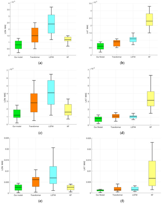 To further assess the impact of step length on ship trajectory prediction tasks, the MAE of different prediction methods at 5, 10, and 20 moments was statistically analyzed. Box plots were used to display the MAE of latitude and longitude attributes, as shown in Figure 11. Additionally, the average RMSE of the four models at different prediction lengths is depicted in Table 4.