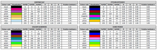 - Python optimizer—we prepared an algorithm that generated the values of relative luminance (0–1) of each colour to maximize the minimum contrast between the closest (most similar) pairs of colours. Then, the particular RGB values were manually selected to match the hues forming subtractive (CMY) and additive (RGB) colours.