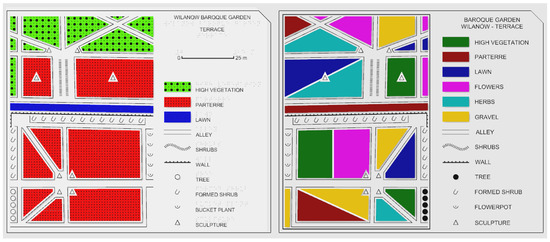 For this study, we modified two tactile maps initially prepared for our project, depicting the Baroque garden in Wilanów (level II) and the English garden in Krasiczyn (level II). These maps convey characteristics of their respective garden styles based on qualitative data, portraying features like symmetrical, man-made elements in the Baroque gardens (Figure 2). To align with our goal of testing colour palettes comprising six unique colours plus black and white, we enhanced the maps to include six types of area symbols. The original 3D models were flattened to 2D drawings, removing tactile elements such as black elements forming tactile textures (extruded over the map surface) and retaining only the colour patches (Figure 2).