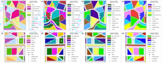 Four map variants, each representing one of the four colour palettes, were prepared for each garden. To mitigate potential memorization during testing, half of the maps were modified by mirroring their content. In total, eight graphic variants of tactile maps were created for this study (Figure 3), with numbers 1–4 denoting types of colour palettes, and letters A and B referring to the mapped locations: English garden in Krasiczyn and Baroque garden in Wilanów, respectively.