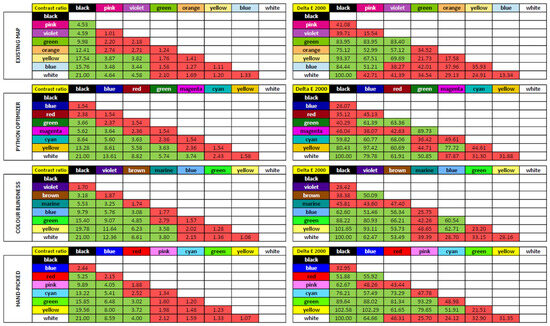 Considering this, only contrast might have been insufficient when designing colour palettes for tactile maps. Thus, we have also measured the change in visual perception of two given colours using the Delta E 2000. It is the newest and most accurate version of the former delta E concept, first introduced in 1976 by the International Commission on Illumination [27]. The calculations are based on LAB coordinates from the CIELAB colour space [28] which is considered a perceptually real colour space, where the Euclidean distance between two colours in this colour space reflect their difference when perceived by sight [29]. Values of delta E over 50 mean that the 2 colours considered are further apart than they are close to each other in the colour space. According to Mokrzycki and Tatol [30], for values of delta E higher than 5, the observer perceives two colours as completely different, but it is sufficient for delta E to be at least 2 for an unexperienced observer to notice the difference in colours (to the best of our knowledge, there was no research on the minimum differences in delta E for PVI to notice colour changes). The formulas are complex and will not be cited in this paper. All the calculations were carried out in spreadsheet software (Microsoft Excel version 2402).
