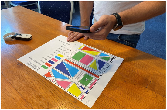 Before testing, participants were asked about their preferences for lighting, position adjustments, or the need for handheld or desktop video magnifiers. During testing, we noted if participants used optical or non-optical aids in reading the maps. Most had no trouble with understanding the maps’ content without additional aids. Some participants needed to enlarge the maps’ content using either magnifiers (two participants), a different set of glasses (two participants), or a smartphone (one participant—Figure 5). Five of the study participants requested a lighting change.