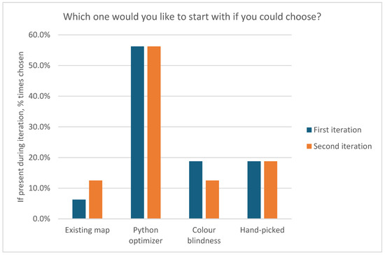 Visibility of particular colour maps was evaluated, inter alia, by asking study participants to indicate the map variant that they would like to start working with when presented with four different variants in two iterations. Each variant was presented at least once to every participant in either first or second iteration of this test (cf. Section 2.2.3.). The Python optimizer palette drew the most attention, chosen by more than half of the testers in both iterations when presented in the set of four maps (Figure 6).