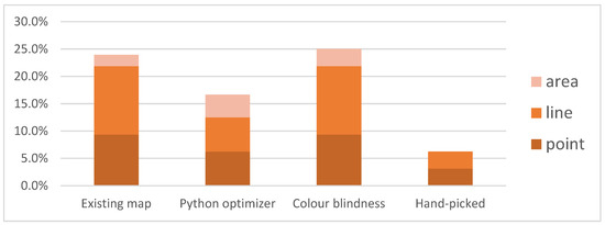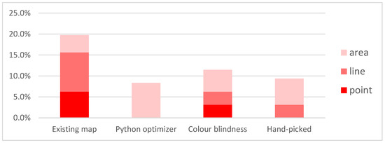 The total number of errors per palette during sessions varied from 7 to 9, with participants indicating two point, two line, and six area symbols on each map. Three of the palettes are characterized by an approximate error rate of 10%, with the Existing map palette standing out negatively with an error rate of 20%. However, although we have tested colour palettes in context and counted errors committed for each type of symbol geometry, in this research, we focus mainly on area symbols that use the colours designed. Having this in mind, the Colour blindness palette is characterized by the lowest number of errors related to area symbols, i.e., 5.2%.