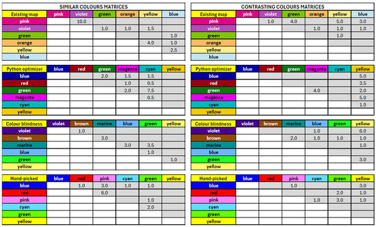 Study participants were also asked (task X.3 in Appendix C) to name colours and/or their meanings from legends that seemed most similar to each other (similar colours matrices in Figure 9—the higher the score, the worse) and the most different from each other (contrasting colours matrices in Figure 9—the higher the score, the better). We have counted these indications with weights assigned, with 1 meaning a strong statement of a study participant and 0.5 for doubtful statements, e.g., a response from participant C10, “If I had to choose something, then I would say that flowers and herbs look similar”, was assigned 0.5 weight.