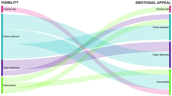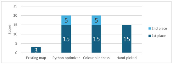 At the end of each session, participants ranked the map variants for Emotional Appeal. Most of the participants were unable to unanimously indicate a single map palette and ranked them by indicating the best and the second-best map (10 participants). Scoring was applied, assigning three points for the best palette and one point for the second best (Figure 10).