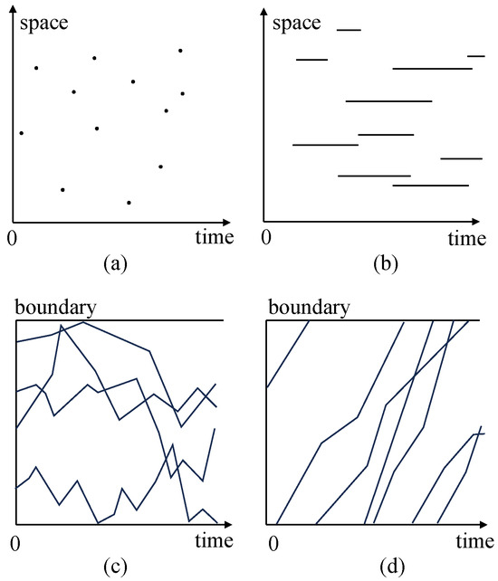 Evolution of space–time in geographical epidemiology. (a) Representation of space–time points. (b) Dynamic points with temporal changes while maintaining a constant spatial location. (c) Points constrained by static barriers that evolve over time. (d) Temporal influence on the entry at point 0 and exit at point B (adapted from Cox and Isham (1980)).