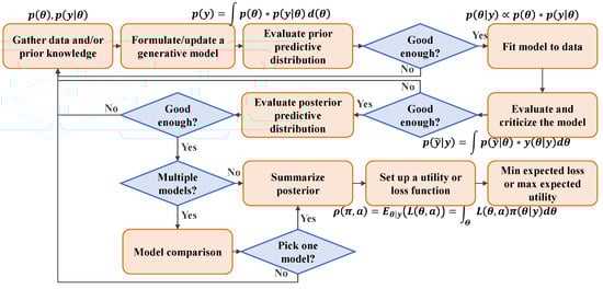 A tutorial on the Bayesian workflow for disease transmission modelling in Stan has been provided (https://mc-stan.org/users/documentation/case-studies/boarding_school_case_study.html, accessed on 28 December 2023). The tutorial illustrates the processes of constructing, fitting, and assessing disease transmission models utilizing a fundamental susceptible–infected–recovered (SIR) model. Figure 4 provides an overview of the Bayesian model’s functionality through a simplified process (adapted from Martin et al. [73]).