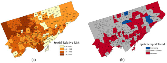 - Nazia, N.; Law, J.; Butt, Z.A. Identifying spatiotemporal patterns of COVID-19 transmissions and the drivers of the patterns in Toronto: A Bayesian hierarchical spatiotemporal modelling. Sci. Rep. 2022, 12, 9369. [Google Scholar] [CrossRef] [PubMed]