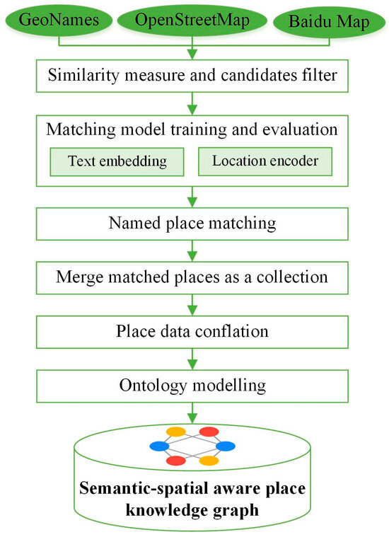 In the construction of multi-source data knowledge graphs that utilize location nodes as geographic references, place entity matching emerges as a pivotal technology [7,8,9,10]. Models for matching place entities can be categorized into two primary types, based on the nature of the data: textual matching and spatial matching. Textual matching processes largely depend on measuring similarities in the text-based attributes of entities, such as the congruence of place names and the likeness of categories, to determine if multiple source place entities refer to the same real-world location [11,12,13]. Conversely, spatial matching utilizes geometric measures of spatial coordinates, including spatial distances, as significant indicators of match suitability [14,15,16]. For the task of matching place entities, traditional rule-based methods necessitate the selection of matching factors for the computation of similarities, setting thresholds for each to ensure proper alignment. The most prevalent technique for amalgamating these similarities is the weighted sum approach within mathematical models, which assigns scores to each matching factor according to its relative weight. To diminish the level of manual intervention and circumvent the need for empirical weight configurations, recent advancements have been made in machine learning-based matching methods. Studies such as those by McKenzie et al. [11] and Santos et al. [17] have showcased models trained on manually annotated datasets, which serve as a substitute for manual parameter settings.