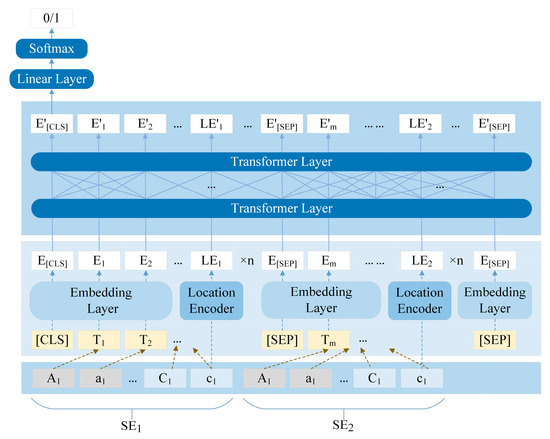 For a pair of place entities constituting a data pair, upon joint input into the model, and tokens are generated for separation and subsequent classification computations. It is key to note that and are Bert model-specific notations for the start and separation of entities. The token serves as a delimiter marking the boundary between the two entities in the data pair, with the beginning and end of the data pair marked by and , respectively. Once processed by the model, the vector generated at the position is fed into a fully connected layer for classification calculation. Therefore, the serialization result of a data pair can be represented in the following format: