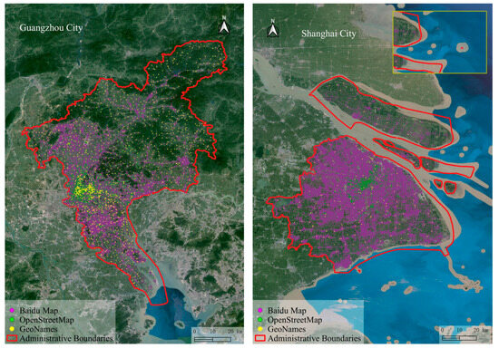 Named place data are available through either authorities or geographical vendors. The former includes data provided by toponymic agencies or gazetteer services, and the latter includes POI data provided by crowdsourcing contributions such as OSM and WikiMapia. In this paper, we select one gazetteer, GeoNames.org (accessed on 21 November 2023), which is one of the most famous accessible geographical databases in the world. For crowdsourcing data sources, we select POIs from OSM, one of the most representative sources of Volunteered Geographic Information (VGI). Furthermore, on the local scale, we select the POI data from one of the most significant Location Based Service (LBS) providers in China, Baidu Map. The empirical study using these datasets helps address the challenges in conflation caused by variability in language, spelling, historical changes, and feature types. Table 1 provides a comparison of the three data sources. Detailed descriptions are given as follows.