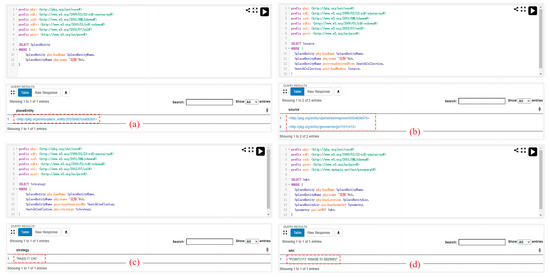 SPARQL queries on the PlaceKG. (a) Query a PlaceEntity instance by name. (b) Query matched named places that the PlaceEntity instance derived from. (c) Query strategies used for the place name conflation. (d) Query the location of the PlaceEntity instance.
