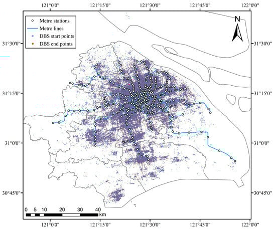 The data should be cleaned before use. First, the starting point or ending point of trips outside the studied area will be removed. Second, trips with incomplete information, such as those lacking a timestamp or position, will be deleted. Finally, we calculate the Euclidean distance and travel time of each trip and remove the trips in which the distance is less than 200 m or greater than 10 km, as well as those in which the travel time is less than 2 min or more than 1 h [19]. After the data cleaning process, we obtained 5,616,151 DBS trips and 25,854,526 metro OD trips.