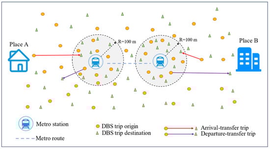 Inspired by Liu et al. [68], we introduce a two-step identification method to explore the integrated trips between DBS and the metro. The first step is finding the DBS trips that fall into the metro station buffer at the spatial level. In this paper, we choose 100 m as the buffer radius around the metro stations. The second step is to match the integrated trips that were found in the first step with the corresponding metro operation time. The trips that were outside of operation time will be removed. As shown in Figure 2, if the starting point of a DBS trip is within any buffer zone of the metro station and the ending point does not belong to any buffer zone, then the trip is departure-transfer trip; if the ending point of a DBS trip is within the buffer zone and the starting point does not belong to any buffer zone, then the trip is arrival-transfer trip. Specially, if the starting and ending points of DBS belong to different metro buffer zones, we choose that point with the shortest distance to metro stations to judge which transfer pattern it belongs to.