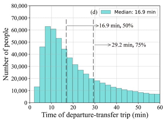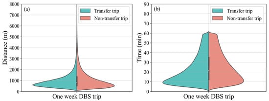 To further detect the characteristics of transfer trips and non-transfer trips, we plot the distributions of (a) distance and (b) time for transfer trips and non-transfer trips in Figure 4. We can see that the most integrated trips’ distances are concentrated between 0 km and 2 km. The travel time of integrated trips are concentrated between 0 min and 30 min. The travel times of DBS trips are affected by the road congestion. Therefore, the travel time distribution of integrated trips spans widely compared to the travel distance.