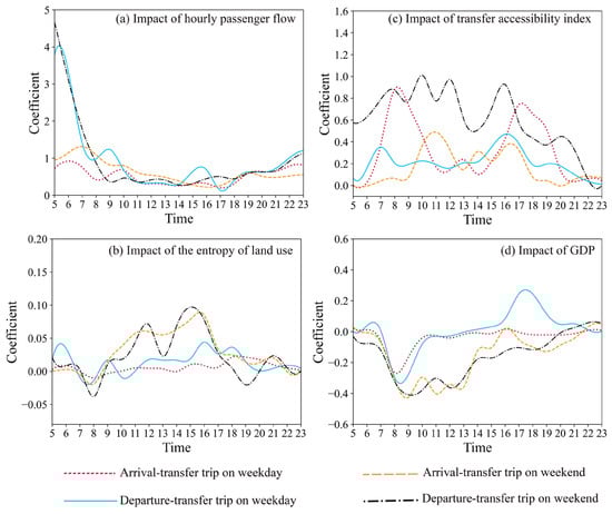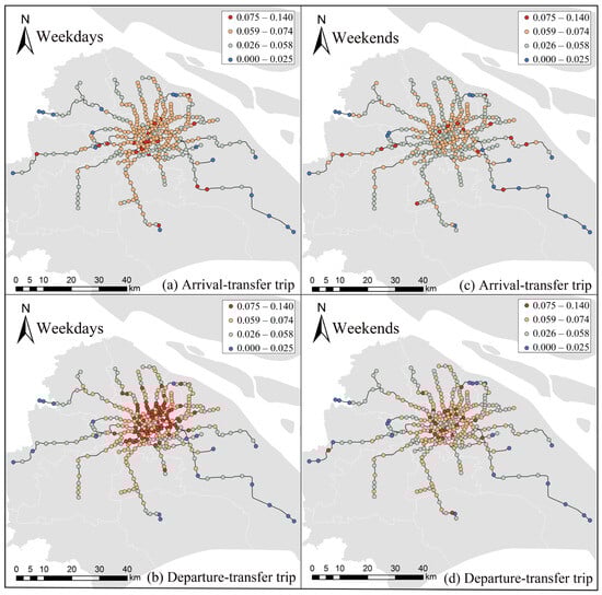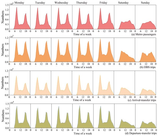 In order to detect the temporal characteristics of integrated trips, we plot the distributions of the number of metro trips, total DBS trips, arrival-transfer trips, and departure-transfer trips in Figure 5. It can be observed that the four kinds of trips have two peak hours in the morning (7:00–9:00) and evening (17:00–19:00), which show obvious commuting characteristics. This result is in line with the previous studies [69]. Moreover, there is a slight peak around 12:00 for integrated trips, which may be because some workers travel for activities at lunch time. On weekends, the number of travelers decreases sharply and shows no obvious peaks for the metro. However, there is one or two peaks for DBS trips on weekends. The distributions of integrated trips, including arrival-transfer trips and departure-transfer trips, are very similar to total DBS trips distribution. However, the start time of integrated trips are different because the integrated trips depend on the operation time of the metro.