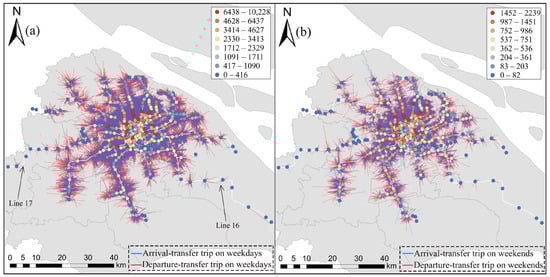 Spatial distributions of integrated trips of DBS–metro on (a) weekdays and (b) weekends.