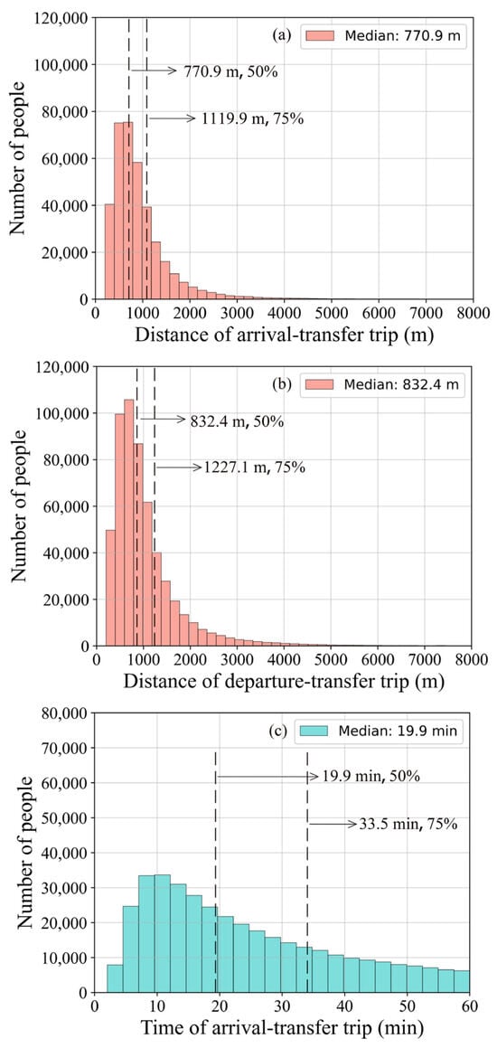 Based on the proposed two-step recognition method, 945,172 integrated trips have been identified, which accounts for 16.8% of total trips. Among them, there are 382,149 arrival-transfer trips, accounting for 40.4% of the total integrated trips, and there are 563,023 departure-transfer trips, accounting for 59.6% of the total integrated trips, as shown in Figure 3. The DBS departure-transfer trip is more than the DBS arrival-transfer trip, indicating that users prefer to use DBS to address the “last mile” problem. The reason is that users can find DBS easily around metro stations, where a large number of DBS are deployed.