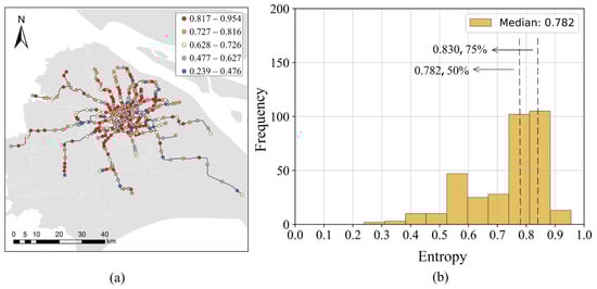 Socioeconomic factors, such as population and income, are considered crucial factors that impact the ridership of public transport [71,72]. In this paper, we adopt three kinds of socioeconomic factors, including GDP, population, and house price. Land use is another very essential impact factor. Typically, the travel activities and behaviors of travelers in different kinds of land use types are different. To measure the differences of different land use mixes, the entropy of land use is introduced, which is calculated as follows [66].