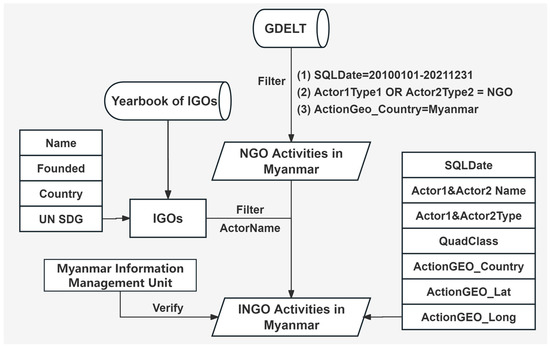 As depicted in Figure 1, the data on NGO activities in Myanmar from 2010 to 2021 were extracted from the GDELT event database based on event time, actor types, and event location. INGO activities were then identified using the IGO directory. In the end, a total of 128 INGOs operating in Myanmar and 11,082 activity data were obtained, which was basically consistent with the official statistics of the Myanmar Information Management Unit [40].