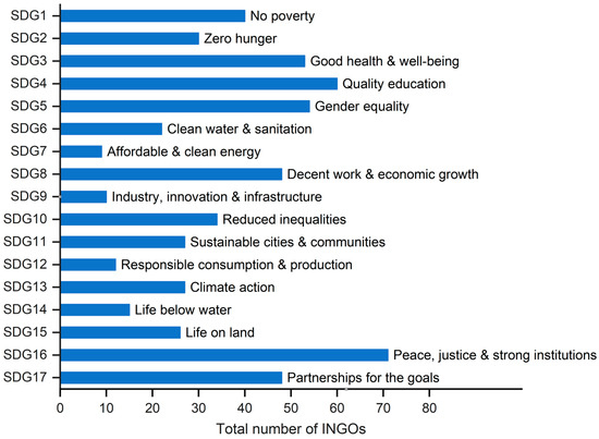 In this paper, we identify a total of 128 INGOs active in Myanmar, of which 26 organizations pursue a single goal, and 102 organizations pursue multiple goals. The selection of SDGs reflects the topics of concern for their activities in Myanmar. As shown in Figure 2, INGOs in Myanmar comprehensively cover 17 goals. The target of Promoting Peaceful and Inclusive Societies (SDG16) has the highest number of organizations, with 71. Quality Education (SDG4) was the second most popular development goal for INGOs in Myanmar, with 60 organizations choosing it. In addition, popular topics among INGOs in Myanmar include No Poverty (SDG1), Good Health and Well-being (SDG3), Gender Equality (SDG5), Decent Work and Economic Growth (SDG8), and Partnerships for the Goals (SDG17). INGO activities in Myanmar were mainly focused on economic assistance, education and training, human rights advocacy, and disaster response, with a predominant focus on assistance and guidance. Some organizations combined relief services with these guiding activities. INGO assistance and guidance activities primarily include skills training, capacity building, microcredit, awareness building, and cooperative development. In contrast, relief services mainly involved medical education, sheltering, environmental protection, animal rescue, and other projects.