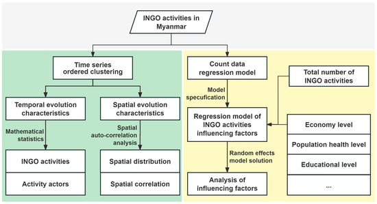 The spatio-temporal distribution of INGO activities and their related factors highlight the inequality of resource distribution. Exploring why INGO activities flow to certain places rather than others is of great significance for optimizing internal and external coordination of organizations, strengthening the management of governmental associations, and deepening the equitable participation of the people. Taking Myanmar as the study area, this study employs time series ordered clustering, global spatial autocorrelation, local spatial autocorrelation, and negative binomial regression to analyze the characteristics of the spatio-temporal evolution of INGO activities in Myanmar and their influencing factors. Since Myanmar started the democratization process in 2010, political deregulation has led to an influx of a large number of INGOs carrying out their activities [35], this study is based on data on INGOs and their activities from 2010 to 2021.