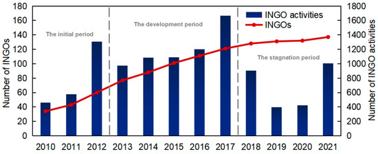Several INGOs began conducting exploratory activities after Myanmar opened up to the outside world in 1988. After that, the Myanmar government carried out a series of political and economic reforms, and a large number of INGOs came in to carry out activities. After the establishment of the new government in Myanmar in 2011, INGOs have increased and expanded both in number and in scope of activities. As illustrated in Figure 5, there has been a gradual increase in INGO activities since 2010, coinciding with the gradual liberalization of Myanmar’s political environment.