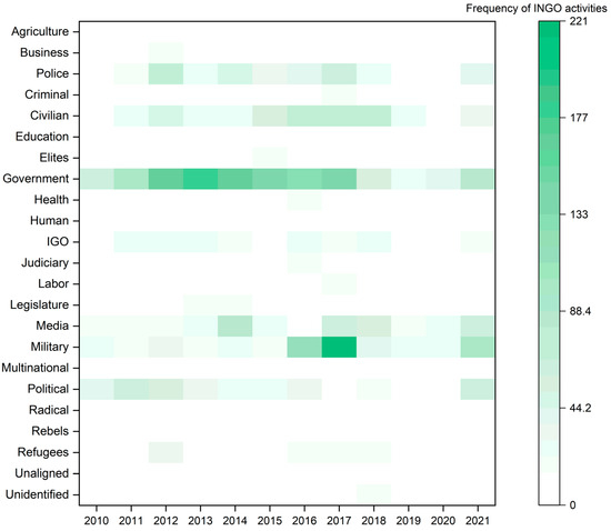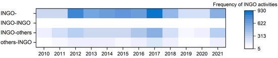 Statistics on the initiators and targets of INGO activities in Myanmar from 2010 to 2021 are shown in Figure 6. The results indicate a clear tendency for the targets of INGO activities in Myanmar, with most activities initiated by INGOs. These organizations primarily carry out public welfare activities and provide financial support, technical guidance, and training for Myanmar’s democratic transition. The most frequent activities were spontaneous by INGOs (without targets), followed by activities targeting other actors in Myanmar. Inter-INGO activities (with INGOs as targets) were not prominent, while the level of activities initiated by other actors in Myanmar was low.