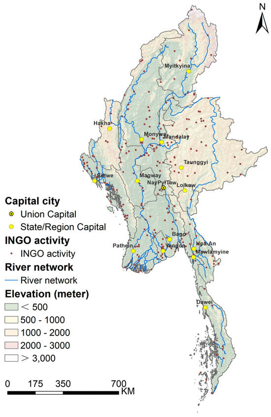 - The Myanmar Information Management Unit Myanmar: Who What Where When for Whom—INGOs and Red Cross—Projects Under Implementation as of 31 August 2023. Available online: https://themimu.info/sites/themimu.info/files/documents/5WMap_INGO_and_RedCross_Aug2023_0.pdf (accessed on 17 October 2023).