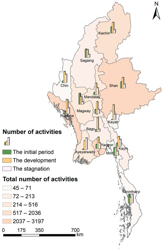 Spatial distribution of type and number of INGO activities in Myanmar over different periods.