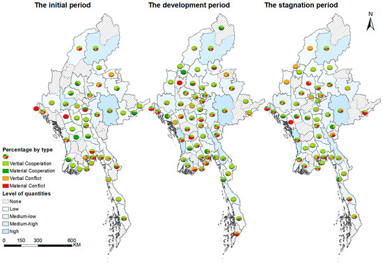 In the initial period, INGO activities were primarily concentrated in regions with easily accessible transportation networks, and their overall scale remained limited. Areas with higher activity levels were mainly distributed along Naypyidaw, the Irrawaddy River, and the Salween River, with Shan State, southern Kachin State, and northern Magway Region being high-incidence areas. During this period, INGO activities concentrated in the central plains of Myanmar were primarily collaborative, with an emphasis on verbal cooperation. Material cooperation efforts were limited to a few specific regions, while verbal conflicts were mainly concentrated on the borders of regions (states). Myanmar’s low level of economic development and its complex terrain, characterized by western mountains and an eastern plateau, contributed to disparities in development between different regions and states. As a result, core cities in the central regions became early focal points for INGO activities. In other areas, the reach of INGO activities remained limited, and during this period, INGO presence had not yet spread across the country.