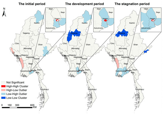To measure the high and low aggregation of INGO activities, the average Moran’s I index of three periods was calculated to explore their spatial aggregation pattern and evolution characteristics. As shown in Table 4, the global Moran’s I index of the three periods was positive.The test results for the initial period were particularly significant, indicating that INGO activities across counties showed a strong positive spatial correlation on a global scale during this phase. Similarly, during both the development and stagnation periods, the global Moran’s I index passed the 1% significance test, demonstrating a noteworthy positive spatial correlation in INGO activities throughout Myanmar. This correlation suggested a clear spatial clustering trend characterized by proximity. In essence, the national pattern of INGO activities in Myanmar predominantly showed “high-high” clusters and “low-low” clusters. From the initial period to the development period, the global Moran’s I index increased, the spatial agglomeration effect of INGO activities increased, and the spatial distribution difference was significant. From the development period to the stagnation period, the global Moran’s I index decreased, the spatial agglomeration effect increased, and the spatial distribution difference tended to be balanced.