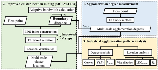 This study aims to propose a new framework for analyzing multi-scale industrial spatial agglomeration patterns that simultaneously consider agglomeration degrees and cluster locations. In the proposed framework, agglomeration degrees are calculated by using the DO index, while cluster locations are estimated based on a newly developed local DO (LDO) index. By incorporating the LDO index, the traditional MCLM method is improved to provide more accurate cluster location mining results with higher efficiency and a more objective parameter setting. The proposed MCLM-LDO method will be compared with three baseline methods based on two synthetic datasets. The integrated DO index and LDO index (DO-LDO) framework will be applied to analyze the spatial agglomeration patterns of the industry of computer, communication, and other electronic equipment manufacturing in Guangdong Province of China from 2000 to 2022. The remainder of this study is organized as follows. Section 2 describes the proposed framework and Section 3 analyzes the experimental results, followed by the discussion and conclusions in Section 4 and Section 5.