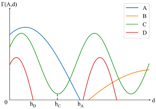 The global scale parameter of the agglomerated industry, , is determined as the smaller distance between the first decline of the curve to 0 and the first curve trough. For example, in Figure 2, the localization index curves of industries A, C, and D exhibit greater than 0 within short distances, indicating agglomeration. The corresponding , , and represent the for these industries. In contrast, the localization index curve of industry B is greater than 0 at long distances, indicating dispersion [20], with no determined. The local scale parameter refers to Siverman’s optimal bandwidth of the DO index method and is calculated using Equation (2). The difference here is that and represent the standard deviation and lower quartile of distances of firm from the other firms in industry . Through calculation, each firm will have its , which can detect clusters at the local scale different from the global scale.